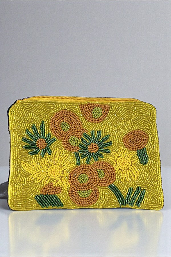 seed bead, multi bead, beaded, mini pouch, floral, flower, yellow,