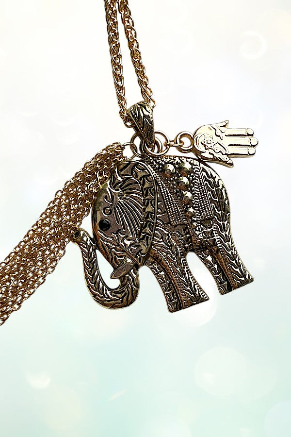 ELEPHANT HAMSA HAND PENDANT LONG NECKLACE