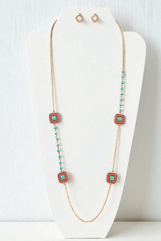 ELONGATED SQUARE BEAD STATION NECKLACE AND EARRING SET, APPROX LENGTH:36" , BACK CLASP CLOSURE