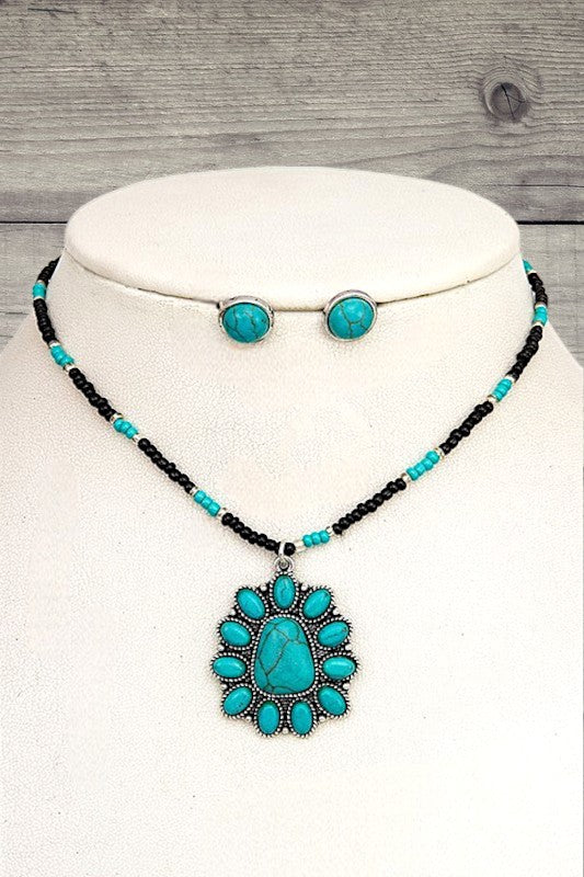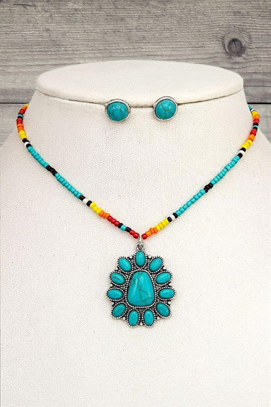 cowgirl, western, bead, multi bead, beaded, gemstone, tq, turquoise, gem post, gem pendant, necklace earring set,