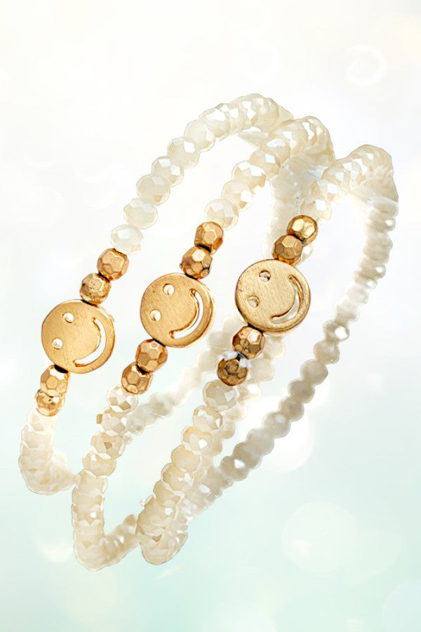 smiley, smile, happy face, emoticon, face, faceted bead, beaded, bead, stretch, bracelet set, 3 bracelets,