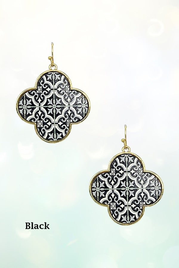 GOLD FRAMED CLOVER SHAPE MIX PRINT WOOD DANGLE EARRING