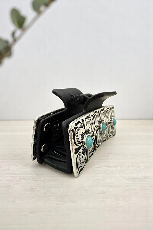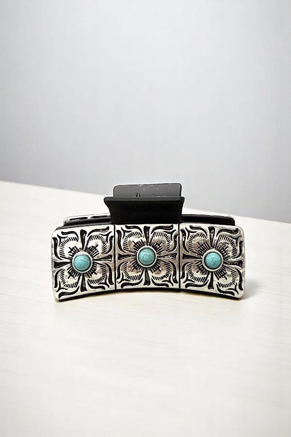 WESTERN THREE FLOWER TQ GEM METAL PLATE HAIR CLAW, APPROX SIZE: 3 1/2" X 1 1/4"