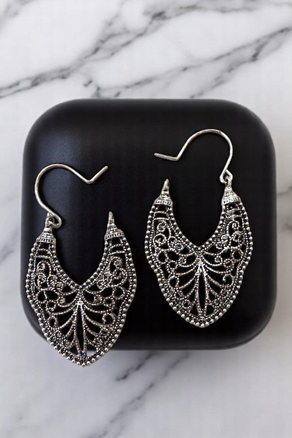 VINTAGE LOOK BUTTERFLY LIKE CUT OUT DANGLE HOOP EARRING, APPROX SIZE: 2 1/4"
