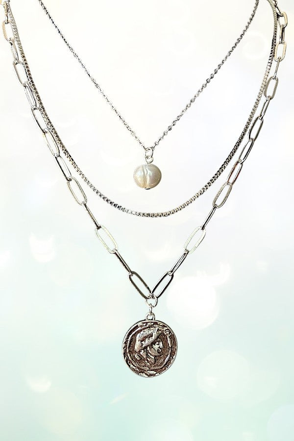 layered, pearl, pendant, chain, disc pendant, disc, necklace earring set,