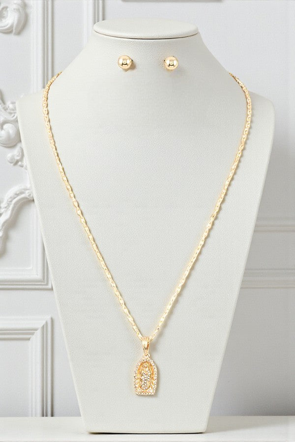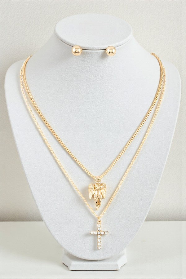 RELIGIOUS PENDANT MULTI LAYERED NECKLACE AND BALL POST EARRING SET