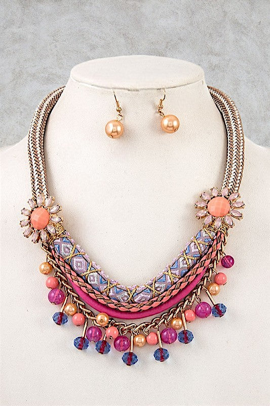 BEADED FLORAL ACCENT CHUNKY ROPE NEKCLACE AND ROUND BEAD DANGLE EARRING SET , APPROX LENGTH:14", BACK CLASP CLOSURE