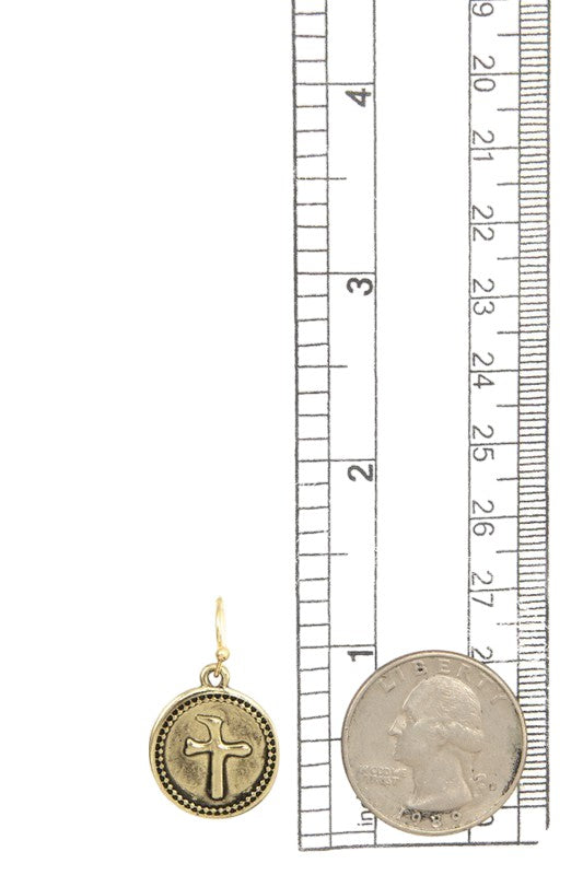 ETCHED CROSS DANGLE DISK CHARMSBNECKLACE AND DISK DANGLE EARRING SET , APPROX LENGTH: 16" , EARRING APPROX SIZE: 1/2", BACK CLASP CLOSURE,