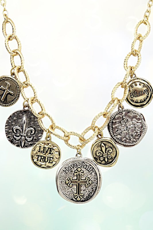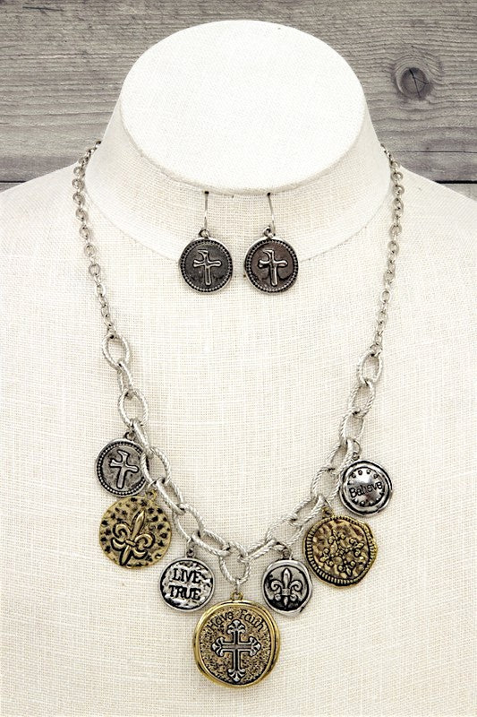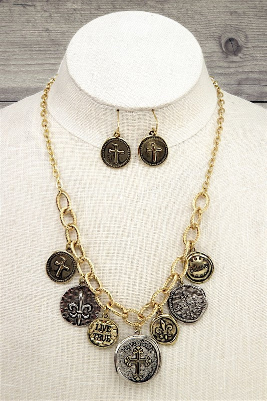 etched, coins, disk, charms, pendants, cross, burnished, chain, western, cowgirl, tribal, inspirational, necklace earring set,