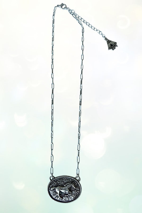 WESTERN RUNNING HORSE ETCHED OVAL PENDANT NECKLACE, APPROX LENGTH: 16"