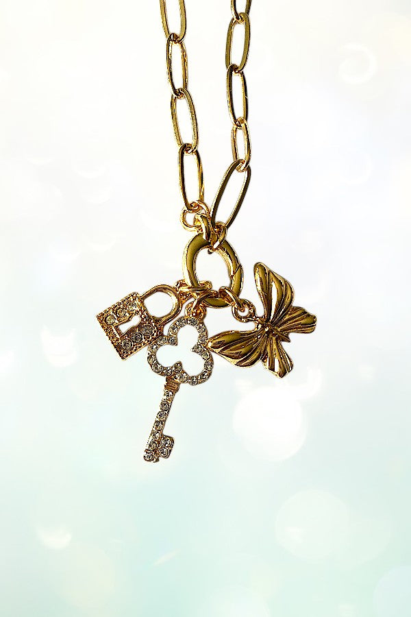 butterfly, rhinestone, pave, lock, key, chain necklace, chain, charm, multi charm,