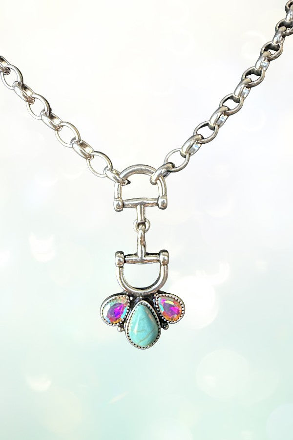 western, rodeo, snaffle bit, tq, turquoise, gem, ab stone, gemstone, pendant necklace, western jewelry, cowgirl, cowgirl style, chain necklace, horse, equestrian, western fashion,