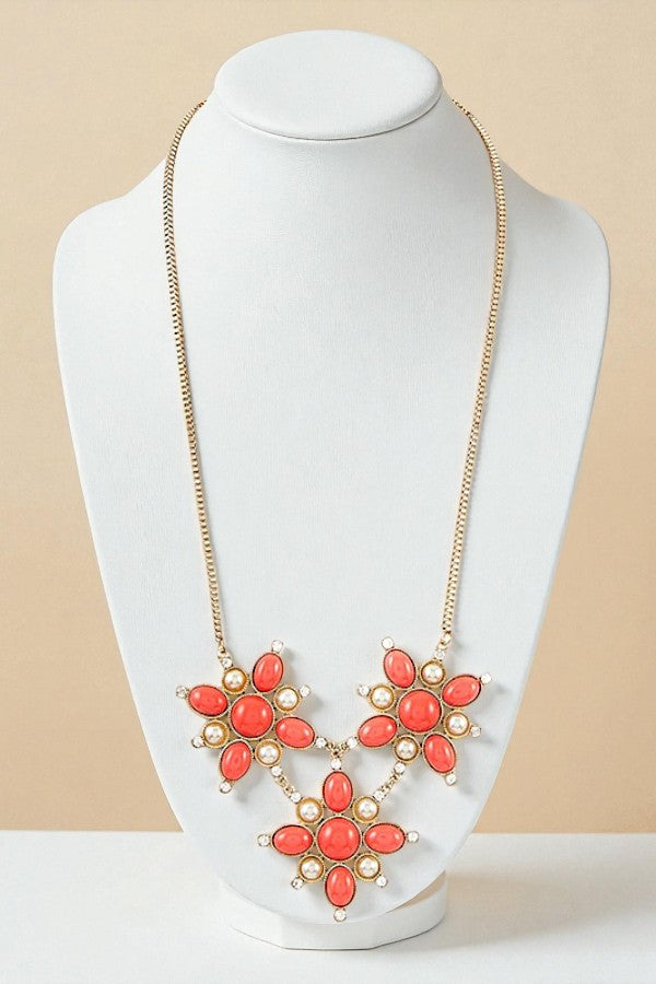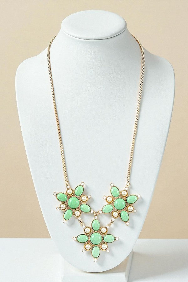 chain, box chain, collar, bib, long, elongated, floral, flower, gem, gemstone, rhinestone, statement,