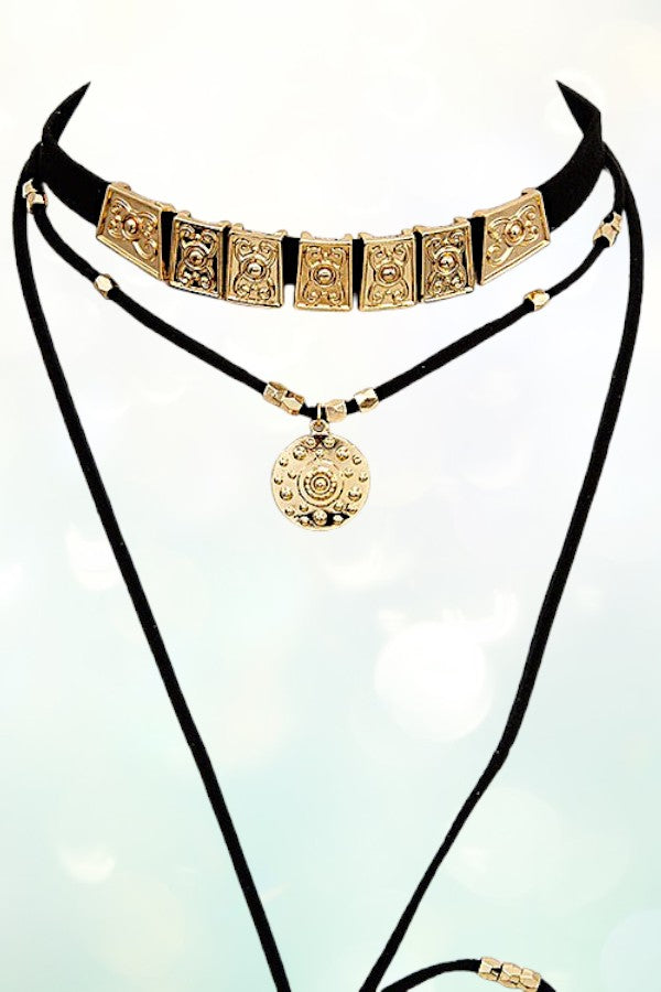 choker, cord, tie, metal accent, etched, layered, multi layer, black cord, western, cowgirl,