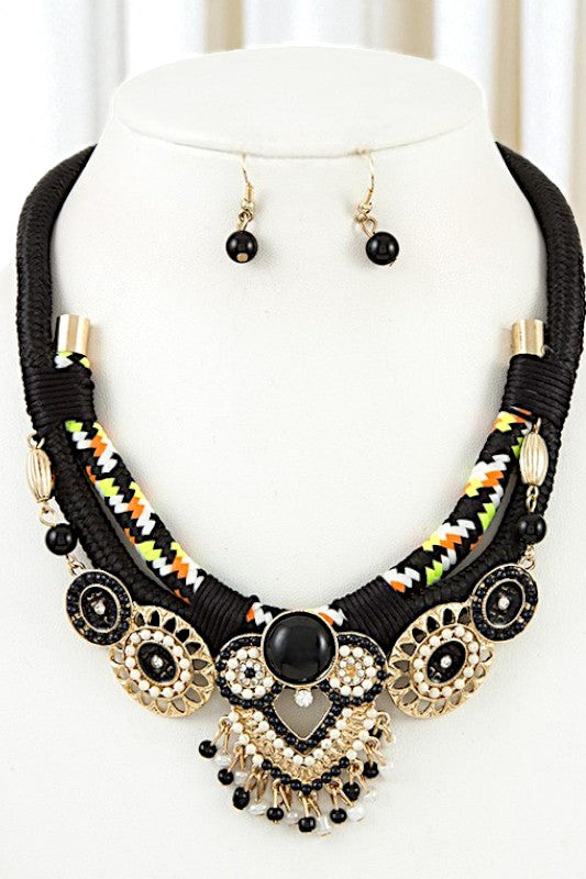 western, tribal, statement, rope, cord, bib, necklace earring set, ornate, gem, round gem,