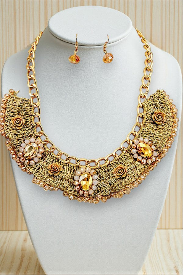 rose, flower, flower, gem, bead, beaded, woven, ornate, bib, collar, statement, necklace earring set, gem bead, dangle, faceted,