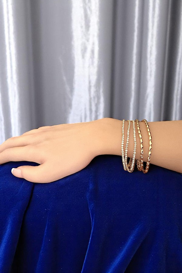WATER RESISTANT, 5 SET TENNIS AND OAVL METAL BEAD BRACELET SET, LIGHT WEIGHT STRETCH BRACELET SET
