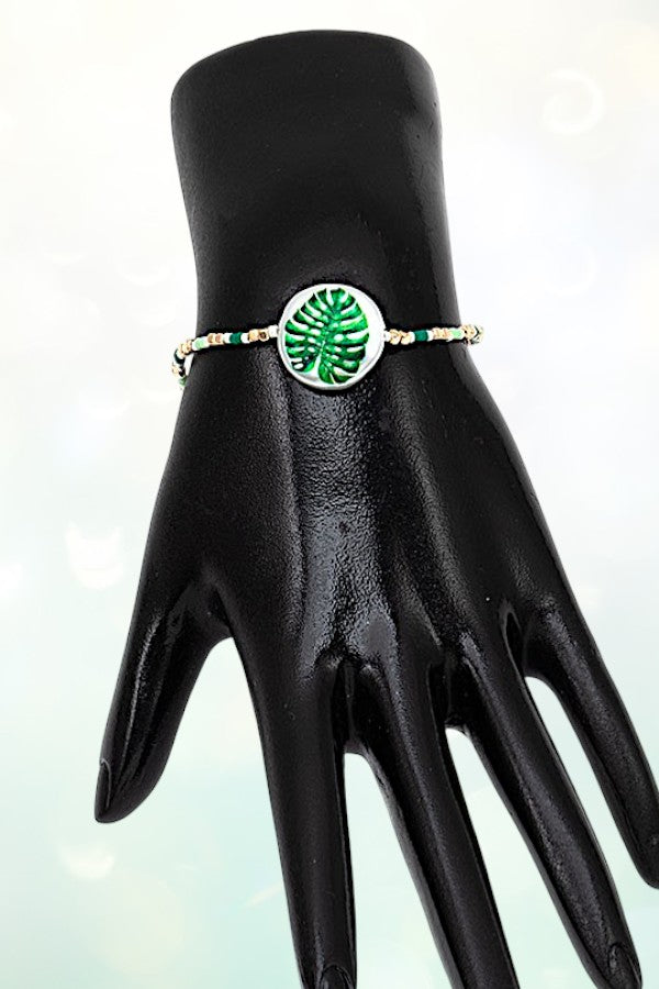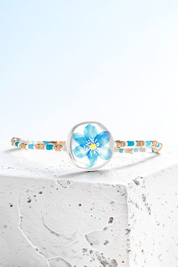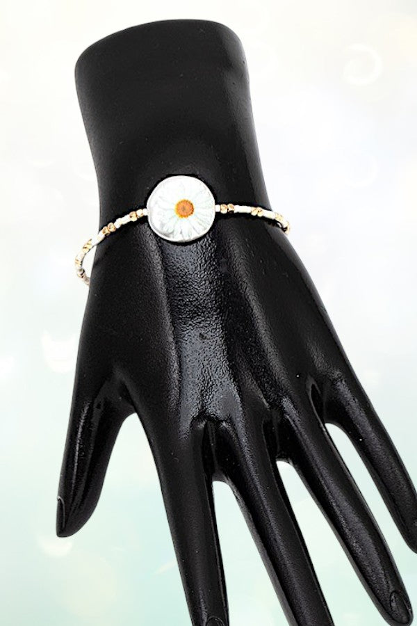 FLOWER IMPRINTED BUTTON ACCENT CUBIC BEAD STRETCH BRACELET