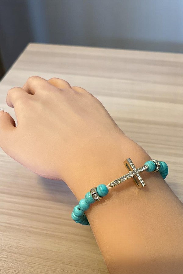 TURQUOISE BEADS RHINESTONE CROSS ACCENT BRACELET, STRETCH BRACELET