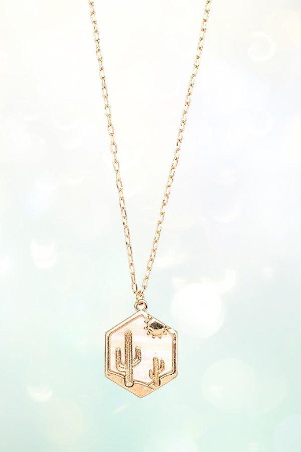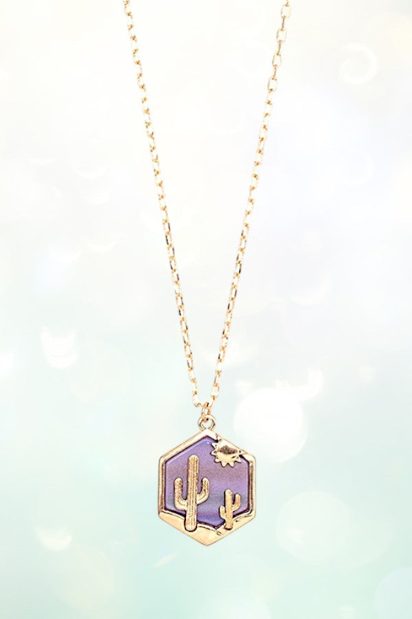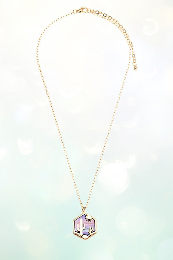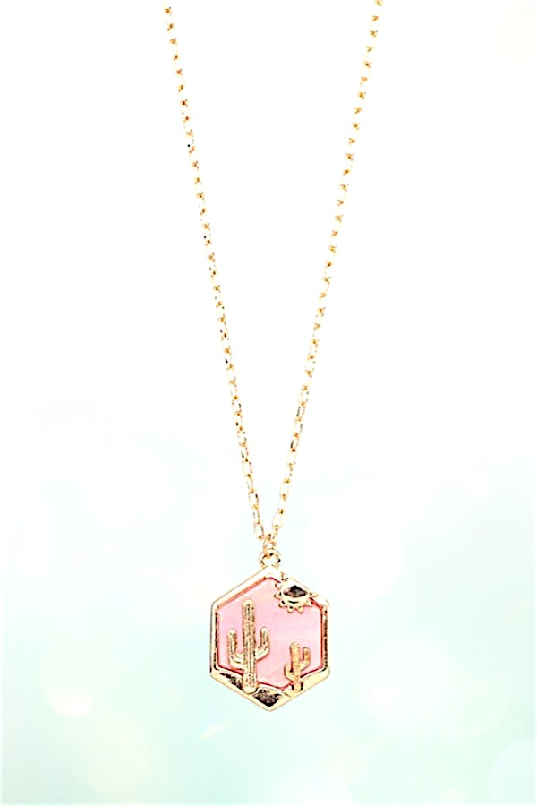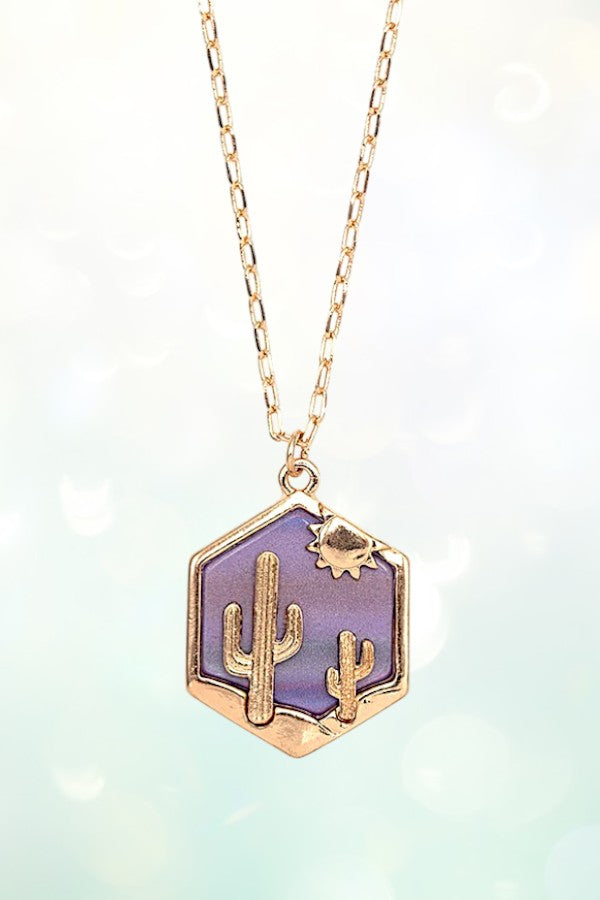 western, cactus, sun, desert, hexagon, shape, geo shape, western necklace, hexagon pendant, cowgirl, cowgirl style, wild west,