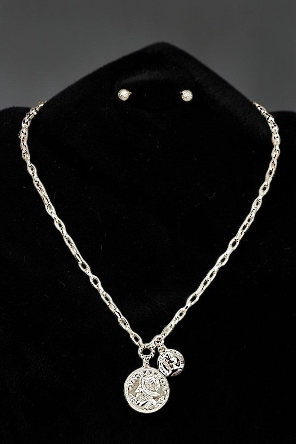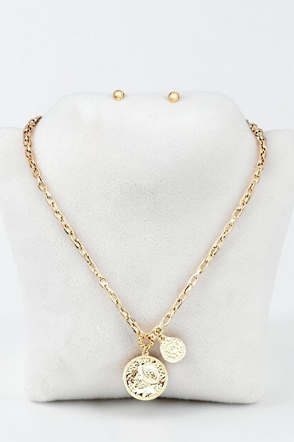 DOUBLE ETCHED COIN PENDANT CHAIN NECKLACE AND BALL POST EARRING SET