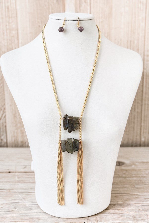 statement, chain tassel, stones, stone link, long necklace, elongated, tribal, western, stone drops, necklace earring set, ball bead earring, cowgirl, statement necklace, necklace set,