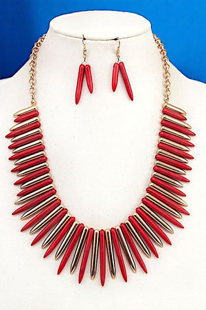 statement, fringe, spike, red, necklace earring set, collar, bib,