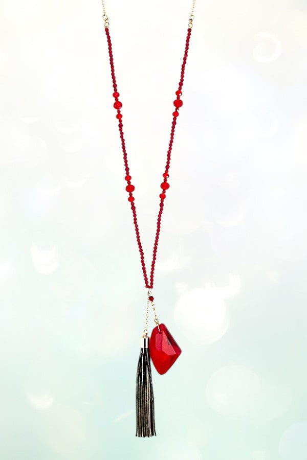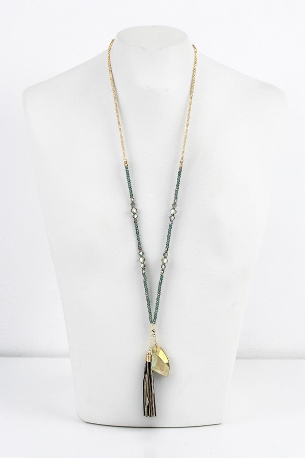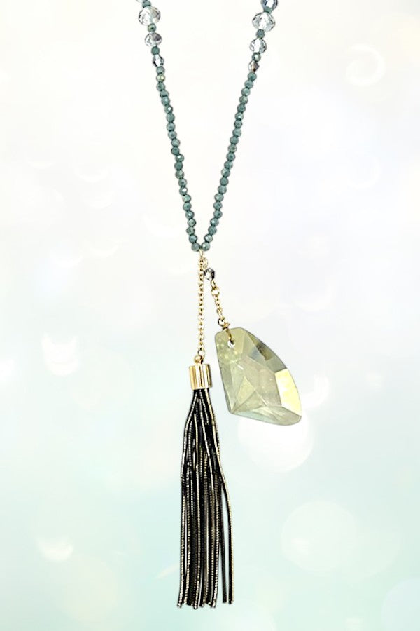 long necklace, bead, beaded, elongated, large gem, gemstone, gem pendant, tassel, long tassel,