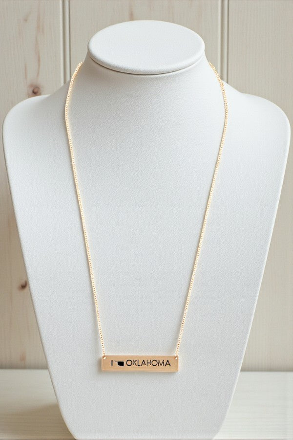 OKLAHOMA STATE SHAPE CUT OUT OKLAHOMA ETCHED BAR PENDANT NENCKLACE