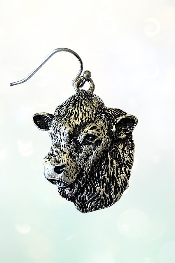 cow head, animal, western, cowgirl, cowboy, western earring, animal head, etched, cowgirl style, western jewelry, dangle earring, burnished silver,