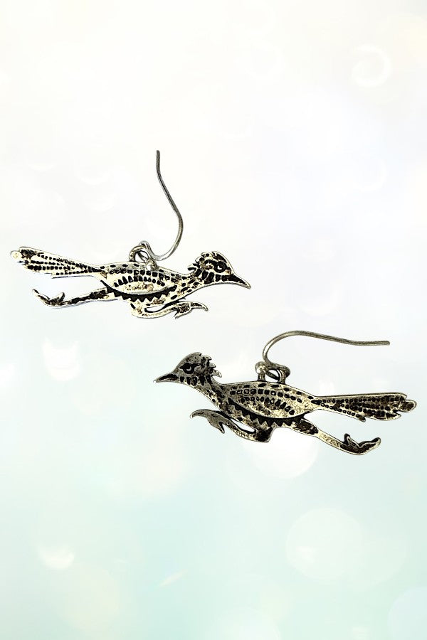 roadrunner, bird, animal, western, western earring, burnished silver, animal earring, dangle, etched, etched bird,