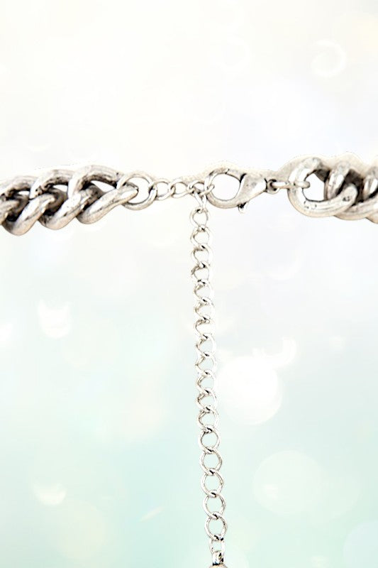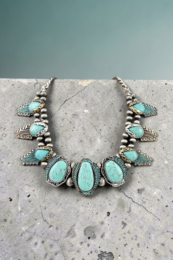 WESTERN FRAMED FAUX TQ GEM NAVAJO PEARL BEAD LINK STATEMENT NECKLACE AND BALL BEAD DANGLE EARRING