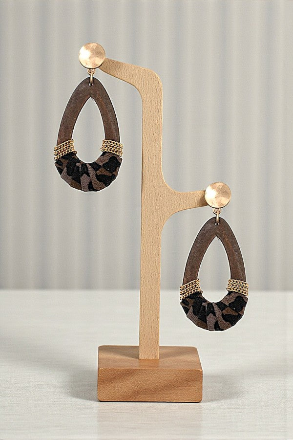 WOODEN TEARDROP ANIMAL PRINT FABRIC AND CHAIN WRAPPED DROP EARRING