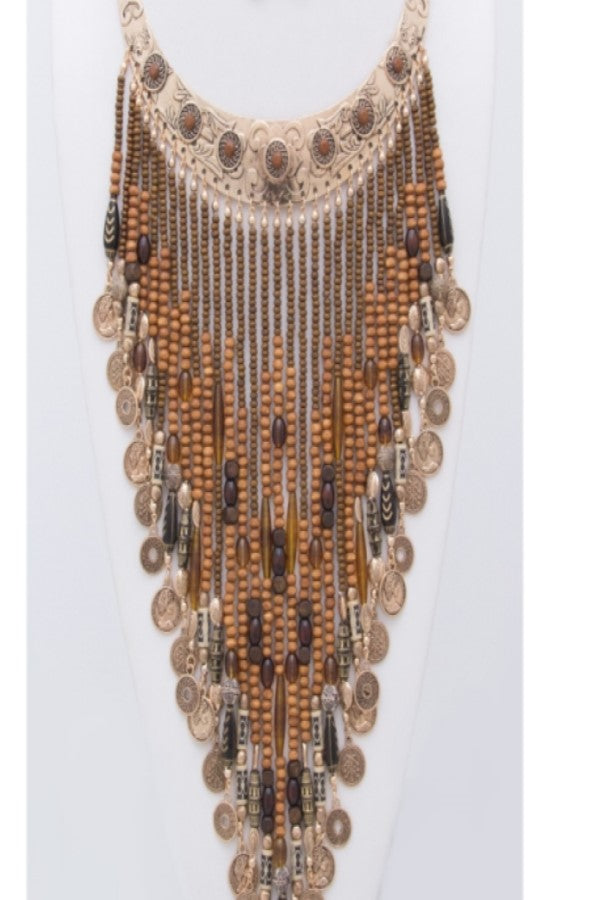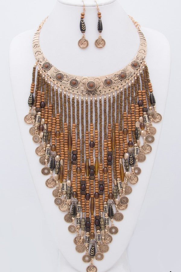 Accent Disk Wood Bead Fringe Necklace Set Approx Length: 18"