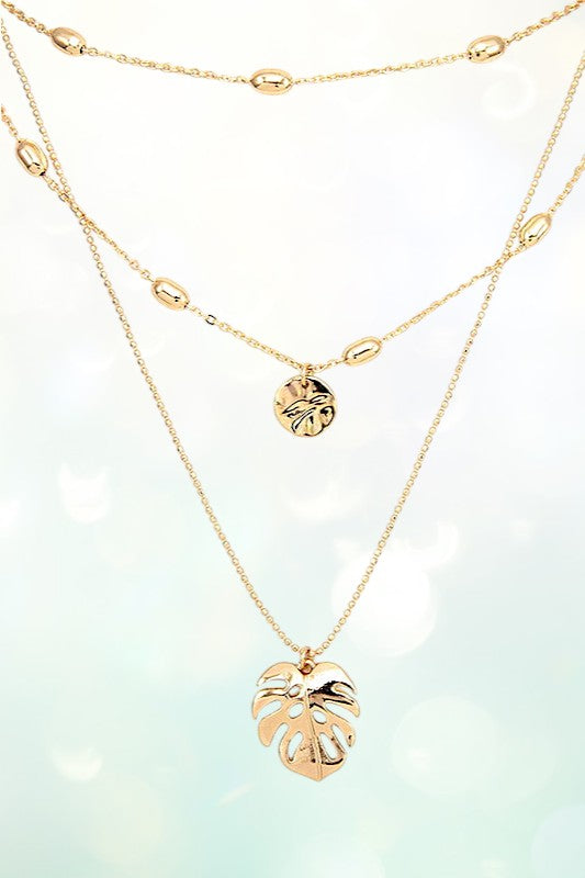 BEAD STATION LEAF PENDANT LAYERED NECKLACE AND BALL POST EARRING SET , APPROX LENGTH: 12" 14" 16" , 3 LAYERS IN SINGLE CLASP CLOSURE