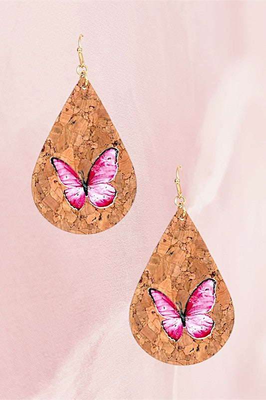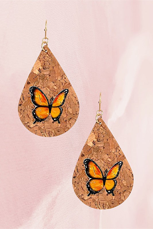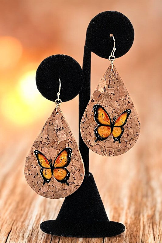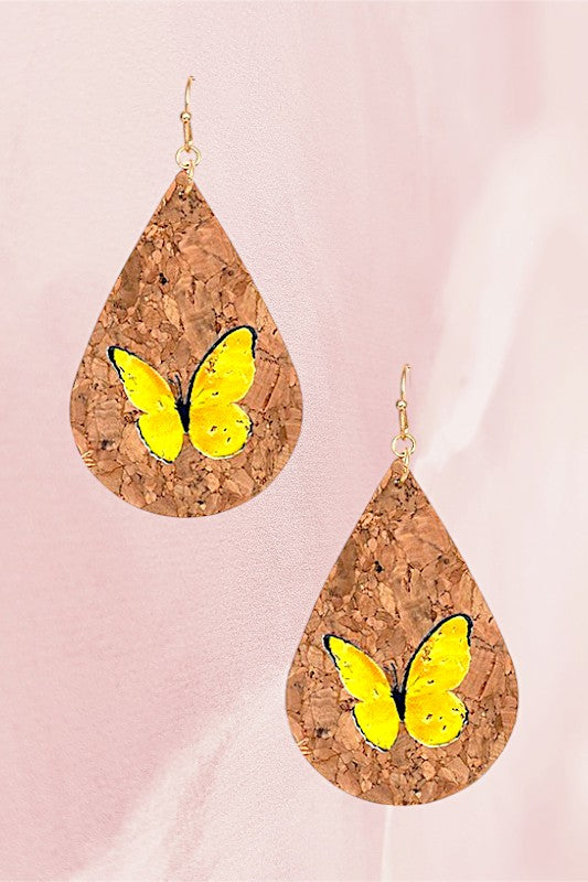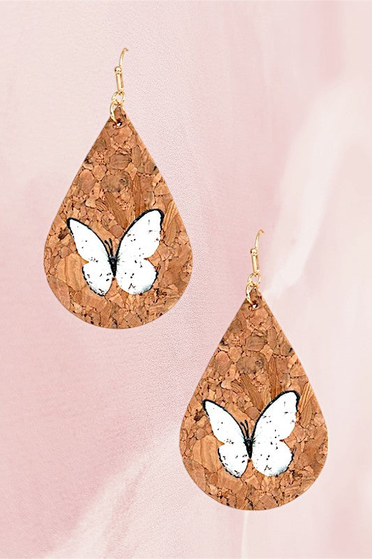 BUTTERFLY ACCENT CORK TEARDROP EARRING, APPROX SIZE: 2"