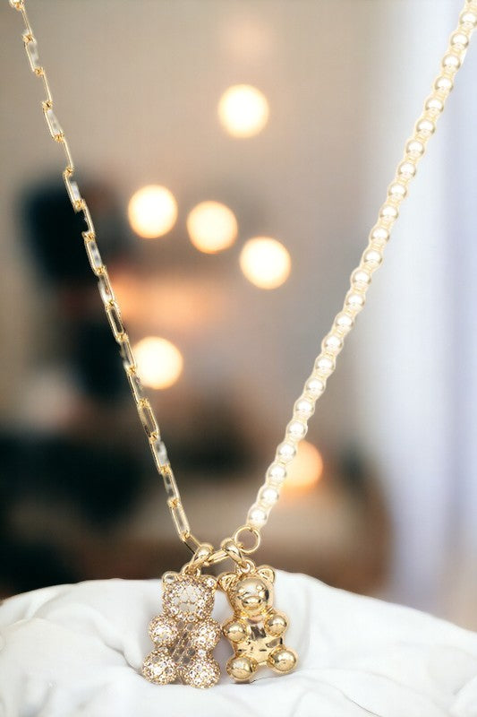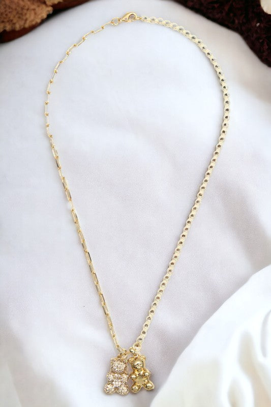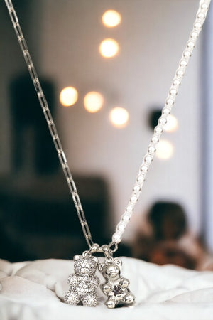 Double Teddy Pendant Necklace Approx Length: 16" White Gold Dipped Made in Korea