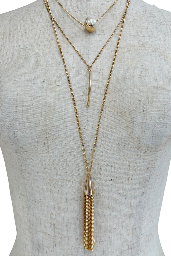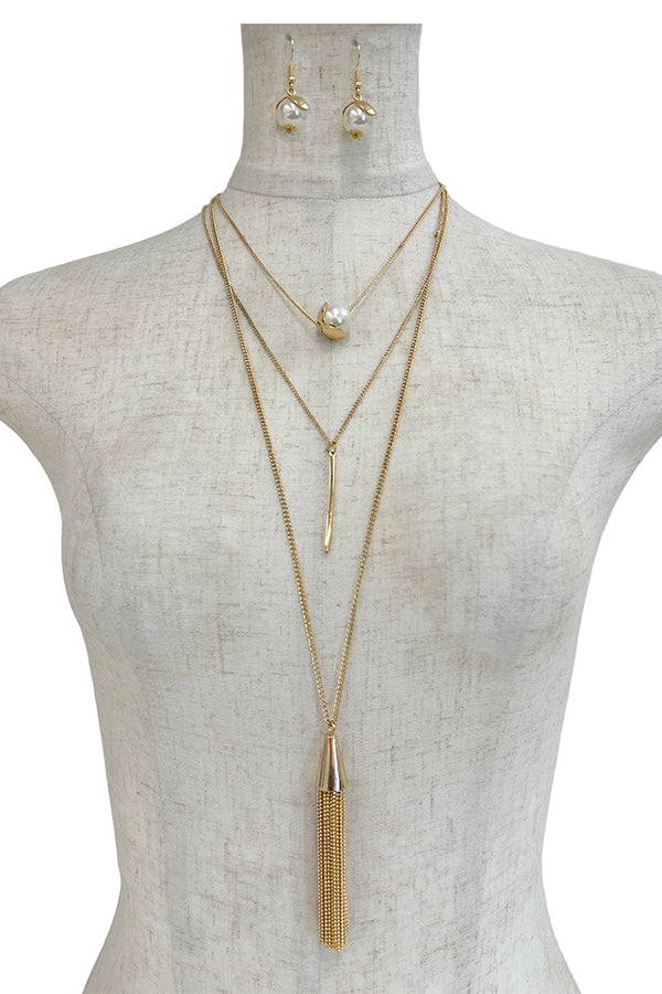 Elongated Layered Pearl Pendant Necklace Set Approx Length: 30"