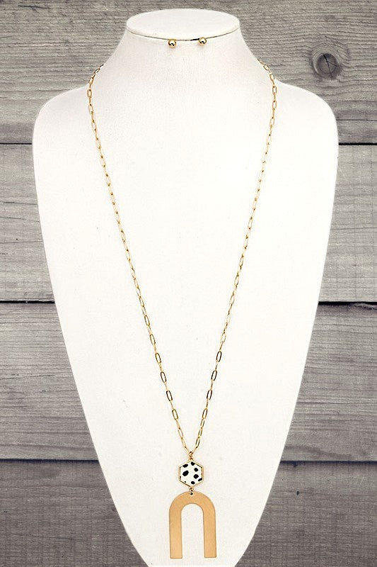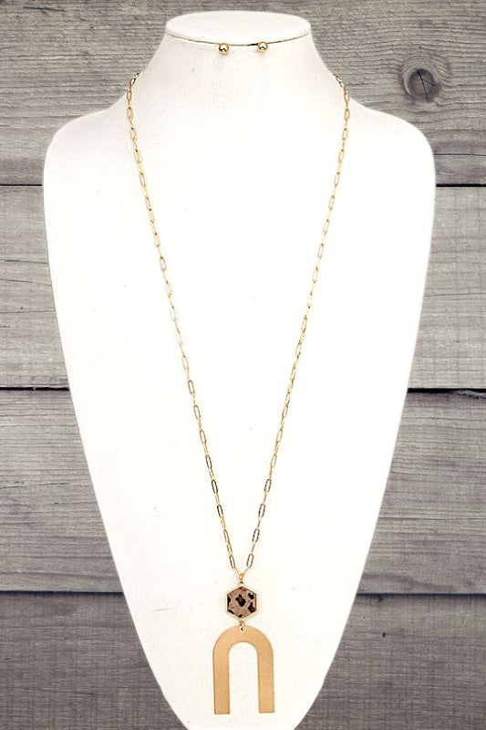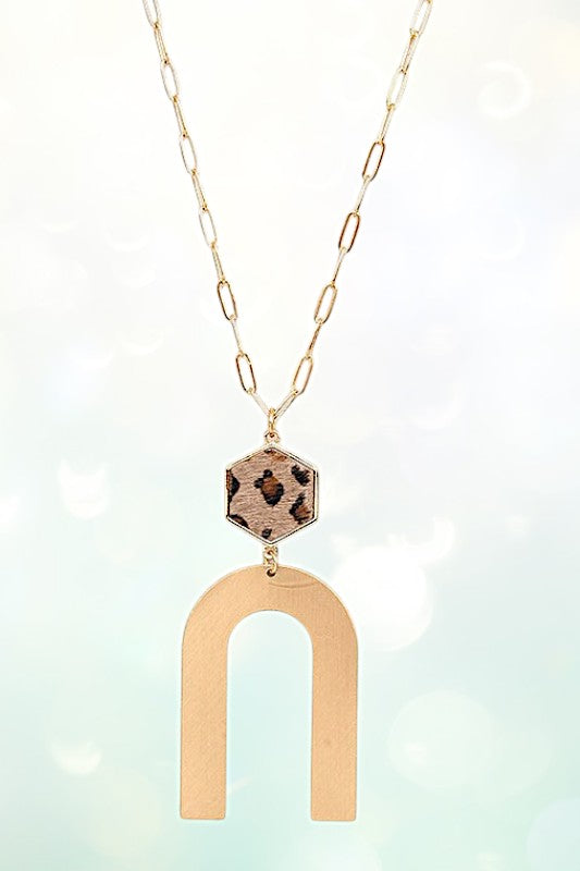 animal, animal print, leopard, matte gold, long necklace, necklace earring set, u pendant, western, cowgirl,