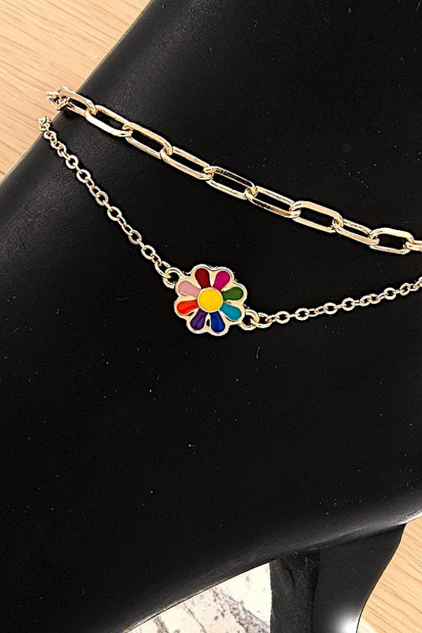FLOWER CHARM LINK DOUBLE CHAIN ANKLET
