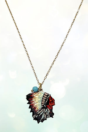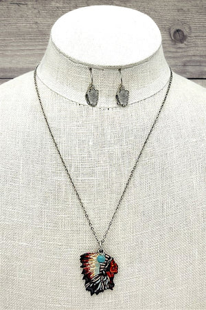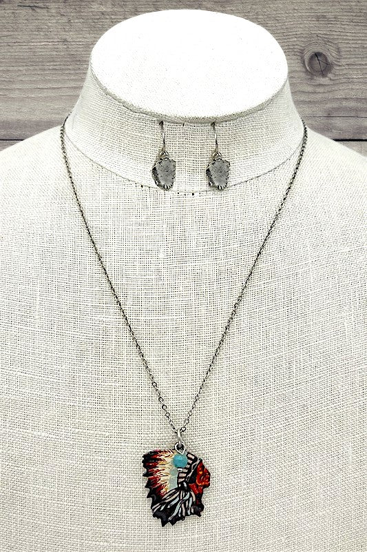 Indian Chief Pendant Necklace and Dangle Earring Set, Approx Length: 16"