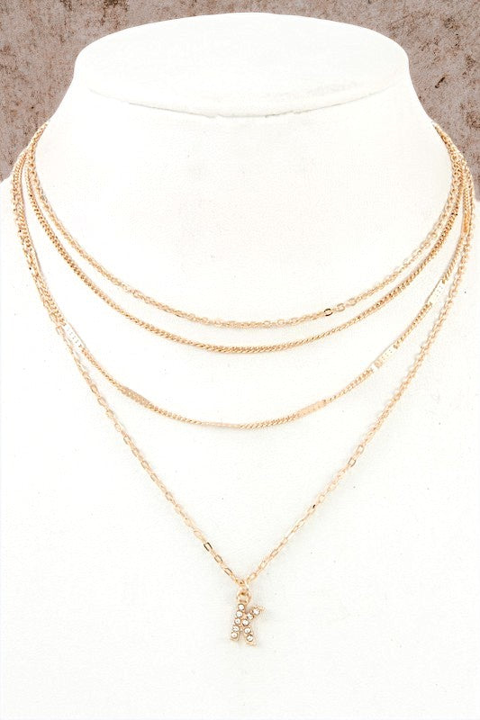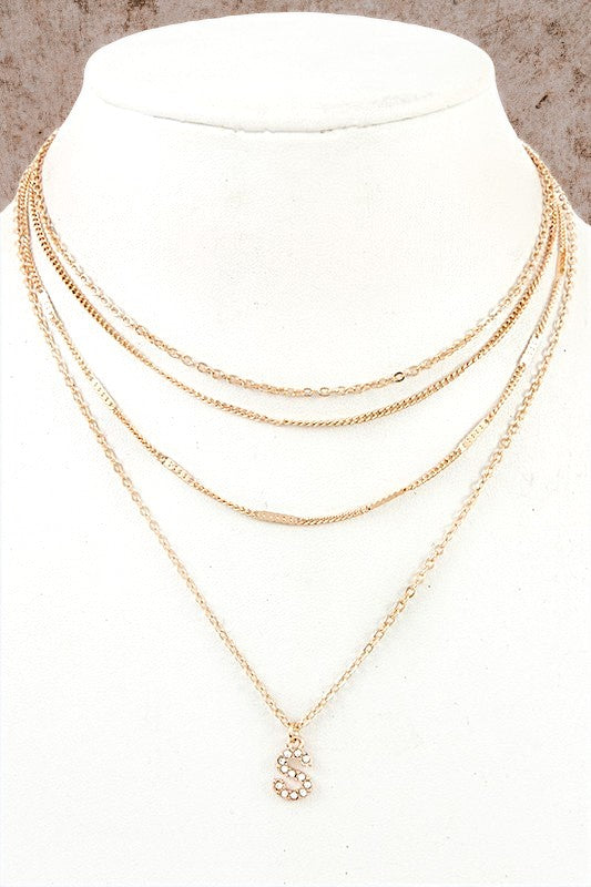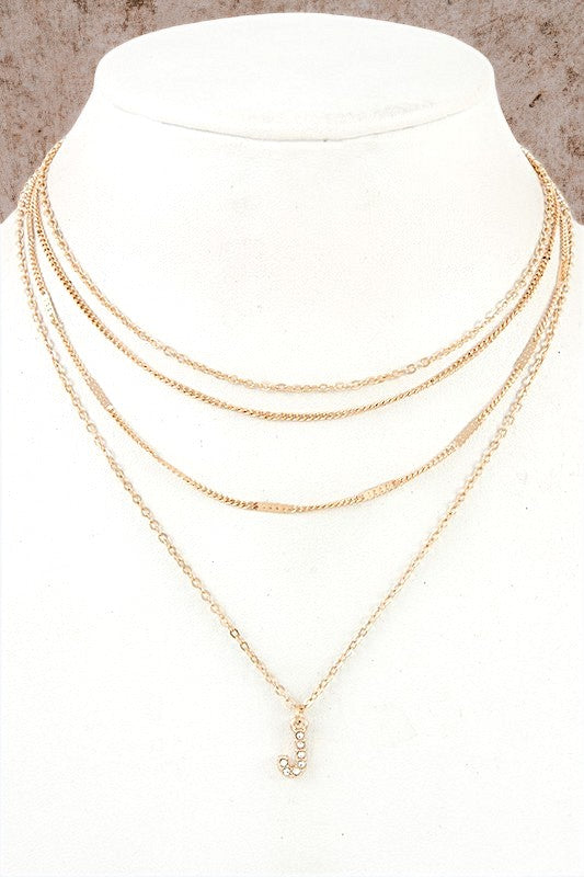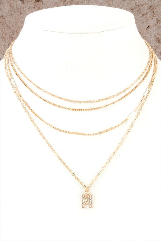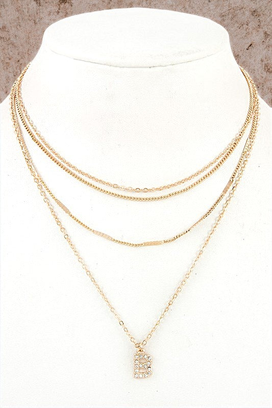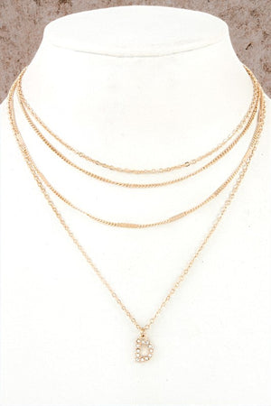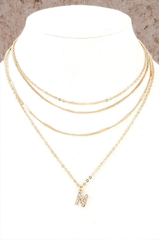 MULTI CHAIN RHINESTONE PAVE MONOGRAM PENDANT NECKLACE , APPROX LENGTH:12" 14" 16" , 4 LAYERED CHAIN NECKLACE, ALL CAN BE WORN SEPARATELY, 4 SEPARATE CLASP CLOSURES