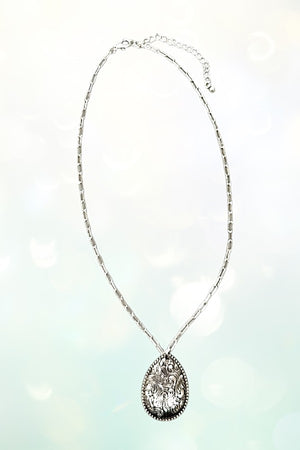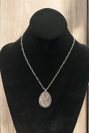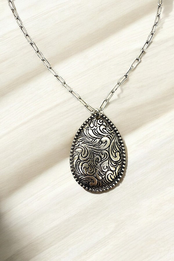 WESTERN ETCHED TEARDROP PENDANT NECKLACE, APPROX LENGTH: 16", , Product color and quality as seen on a monitor may vary slightly compared to actual items due to photography lighting conditions and individual screen color calibration. Please contact LA Bijoux for questions regarding additional item details., , western, cowgirl, etched, teardrop, pendant, burnished silver,