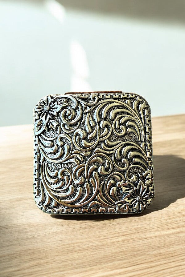 WESTERN PATTERN METAL PLATE JEWELRY BOX, ZIP CLOSE